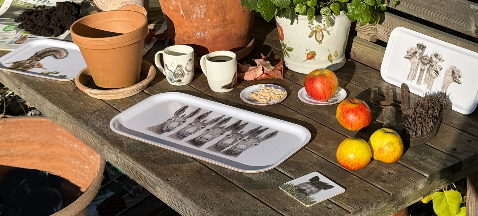 Explore the range of Charlotte Nicolin's art on trays, kitchen towels, mugs, accessories and much more.